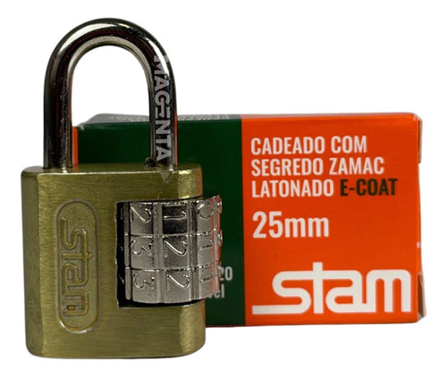 01 - Cadeado Portões Correntes Portas Zamac Latonado E-Coat 25mm Stam de Segredo