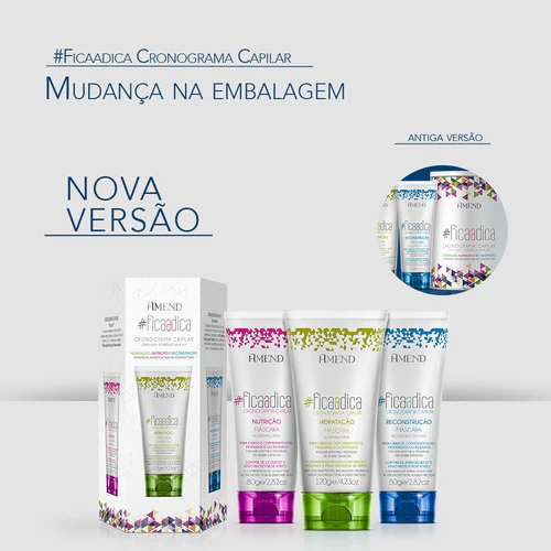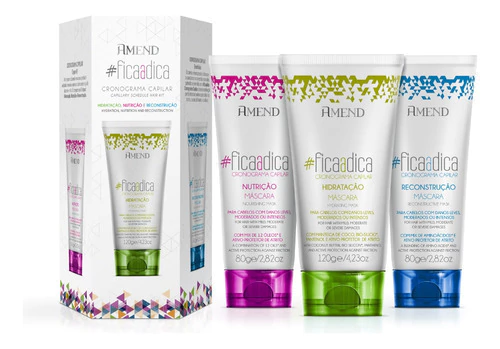 Esse kit contém: Máscara de Nutrição Amend #Ficaadica Cronograma Capilar 80g + Máscara de Reconstrução Amend #Ficaadica Cronograma Capilar 80g + Máscara de Hidratação Amend #Ficaadica Cronograma Capilar+ Cartão com Dicas de Cronograma Capilar. Ação Máscara Hidratação: Repõe os elementos vitais ao equilíbrio e saúde do cabelo, proporcionando toque macio, maleabilidade e brilho. Sua fórmula possui alto teor hidratante e ajuda a manter a umidade natural dos fios.Máscara de Nutrição: Devolve os Lipídios perdidos nos processos químicos ou devido aos danos mecânicos, repondo a lubricidade essencial dos fios. Contém em sua fórmula 12 óleos preciosos e lendários que nutrem as camadas mais profundas da fibra capilar, tornando os cabelos mais resistentes, macios e brilhantes, além de formar um escudo antirressecamento.Máscara Reconstrução: Recupera a massa capilar perdida e repara os fios danificados, porosos e quebradiços, devolvendo a força, o aspecto saudável e o brilho. O Mix de Aminoácidos interage com o cabelo fortalecendo a estrutura interna, protegendo a cor, reparando os danos da superfície e aumentando a resistência dos fios.