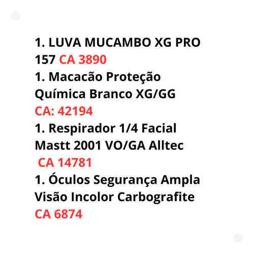 1. Macacão Proteção Química Branco XG/GG CA: 42194