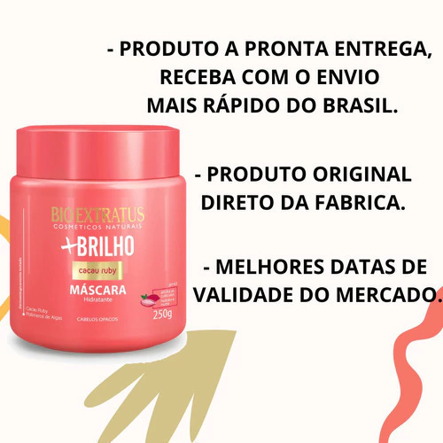 A Máscara Capilar Mais Brilho Bio Extratus Cacau Ruby - 250g foi desenvolvida especialmente para devolver luminosidade, maciez e vitalidade aos cabelos opacos e sem vida. Com fórmula exclusiva rica em extrato de cacau, que nutre e fortalece, e Ruby, um ativo mineral que reflete luz e potencializa o brilho, essa máscara promove um tratamento profundo e instantâneo.